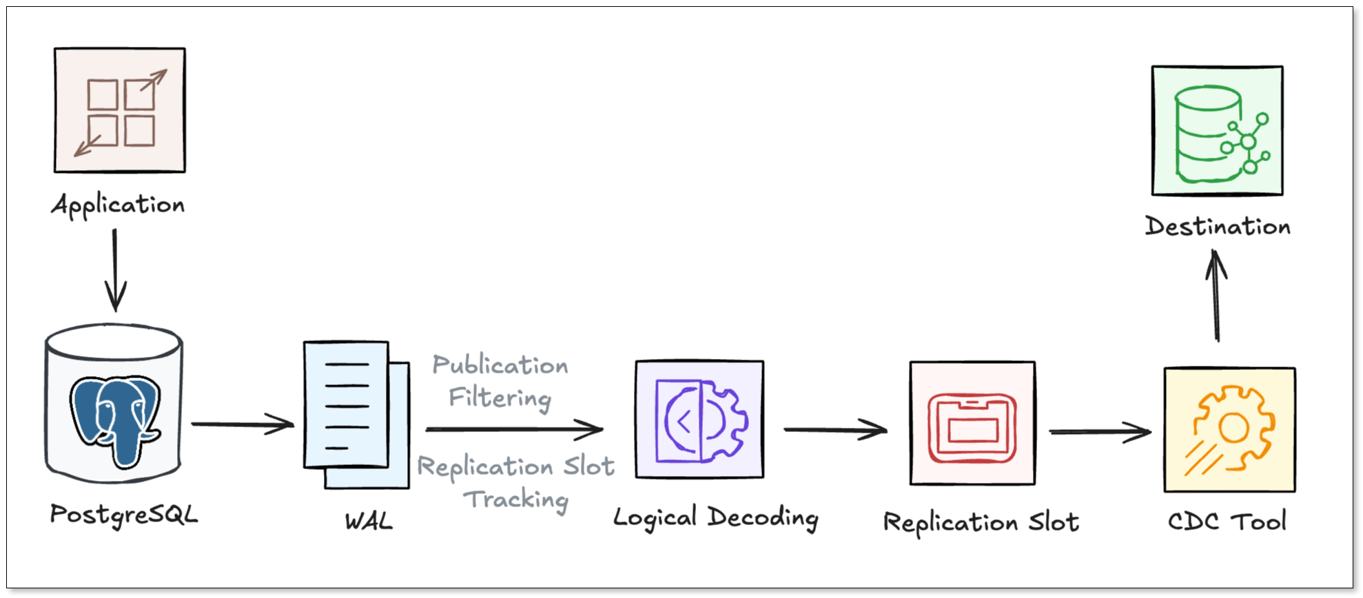 A typical Postgres CDC pipeline usually goes through the following steps:
