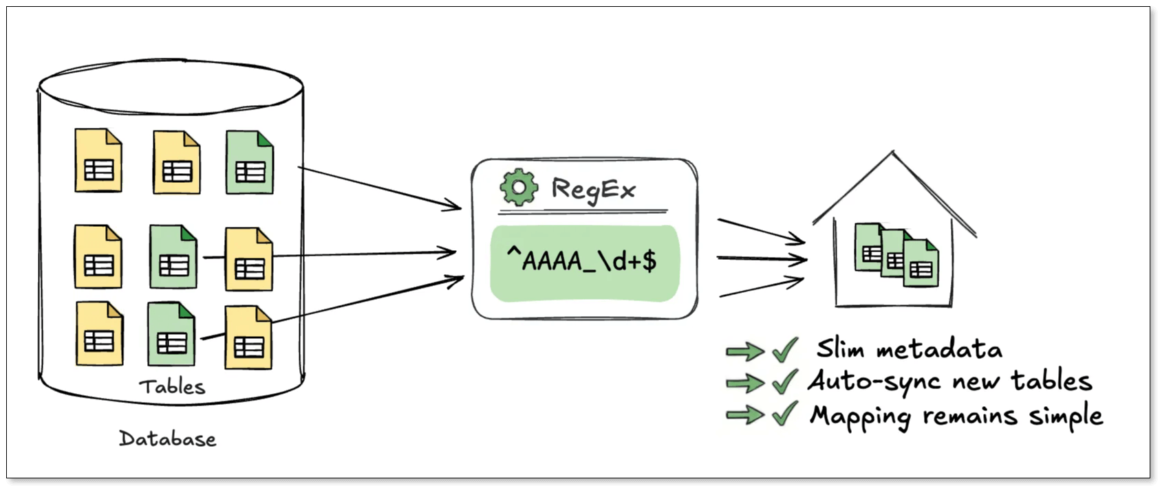 Instead of managing thousands of individual tables, you define rules that describe your data domain. This dramatically reduces operational overhead, avoids metadata bloat, and adapts naturally to fast-changing schemas.