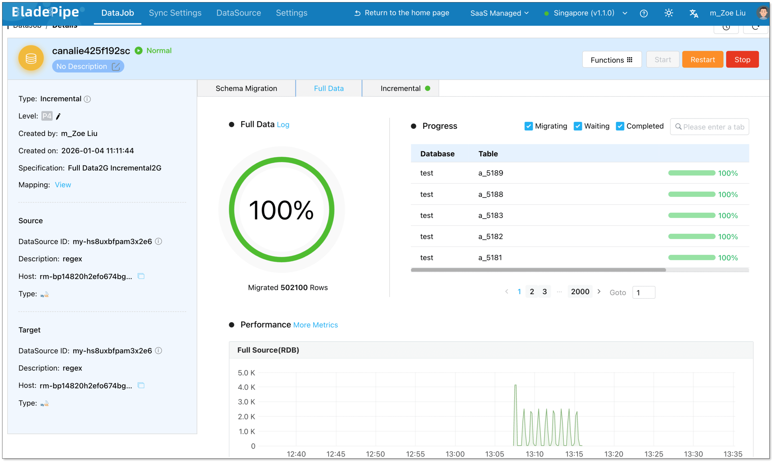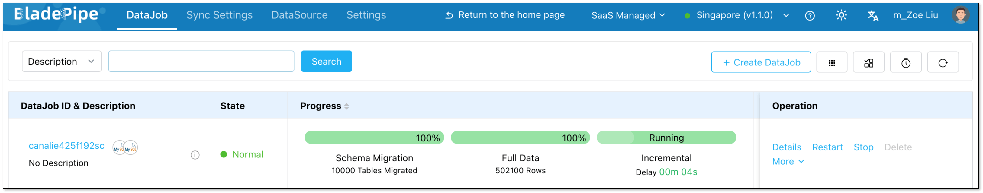 Once started, BladePipe automatically handles schema evolution, full data initialization, and real-time incremental sync.