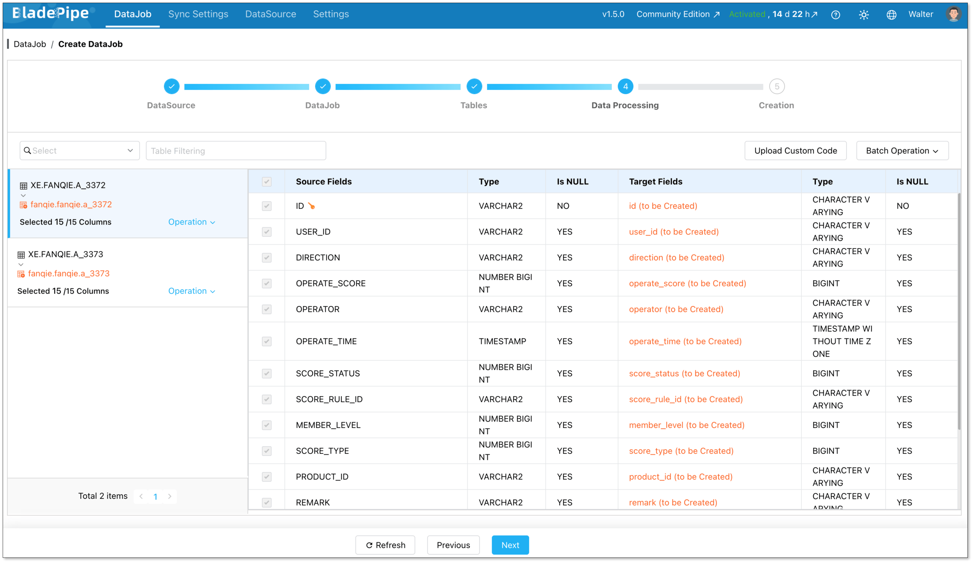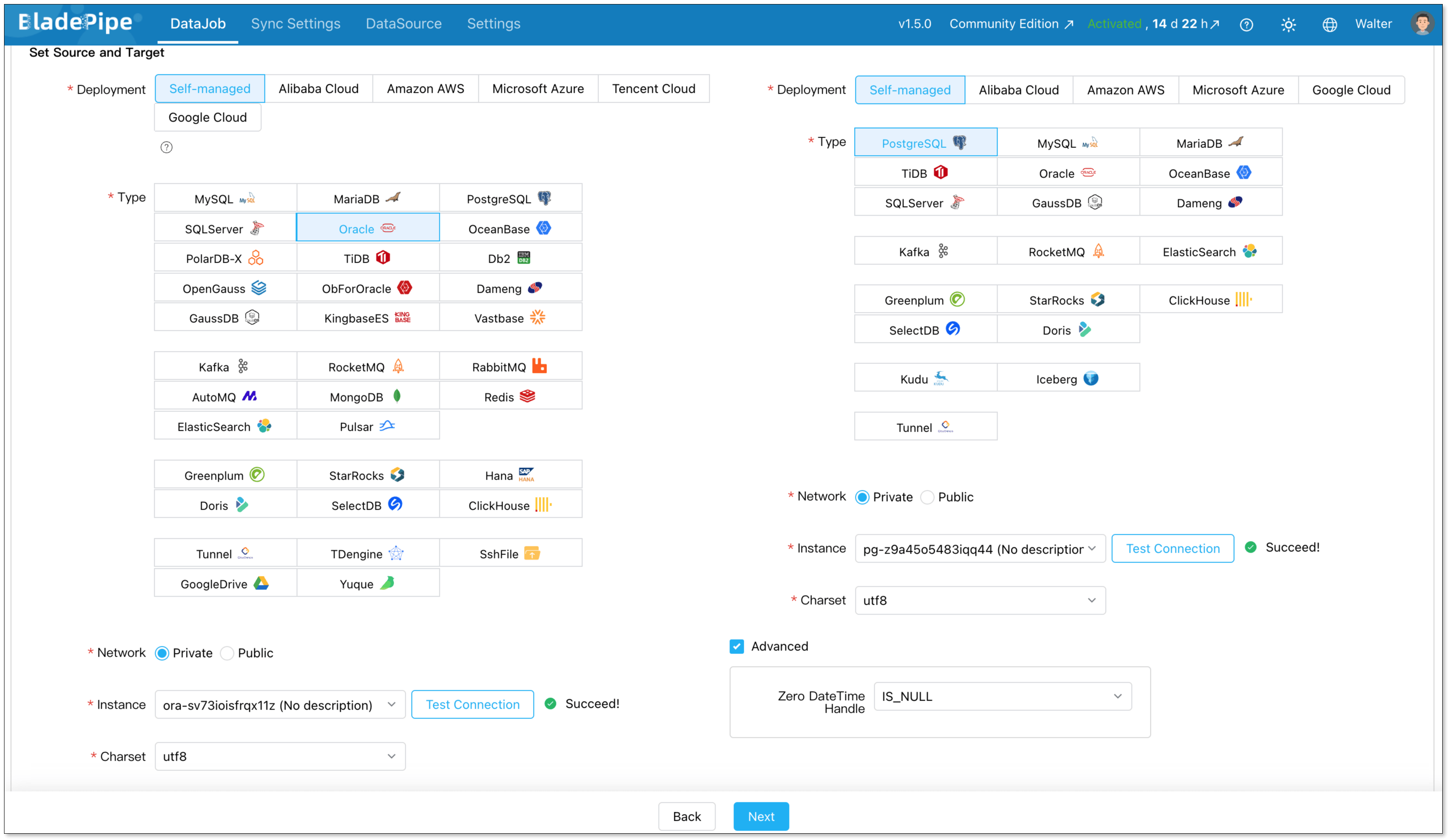 Go to DataJob > Create DataJob. Then select the source and target DataSources, and click Test Connection for both.