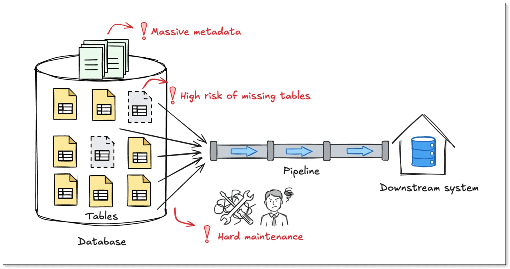 - Full-database replication: To avoid missing tables, some teams replicate everything. In this case, no table will miss. However, you have no flexibility to filter out unnecessary tables. Besides, it still requires tacking schema metadata for every table, and metadata size grows linearly with table count.