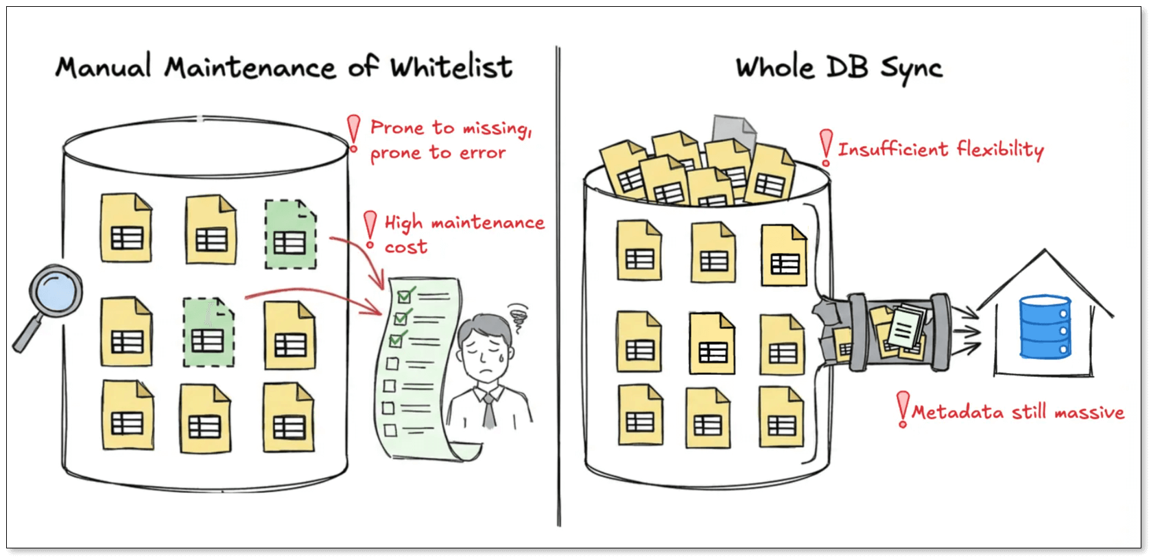 - Manual whitelisting: It's the most common practice, which defines a clear scope, and you have fine-grained control over transformations and mappings. But it's easy to miss table, and you have to bear high operational burden.