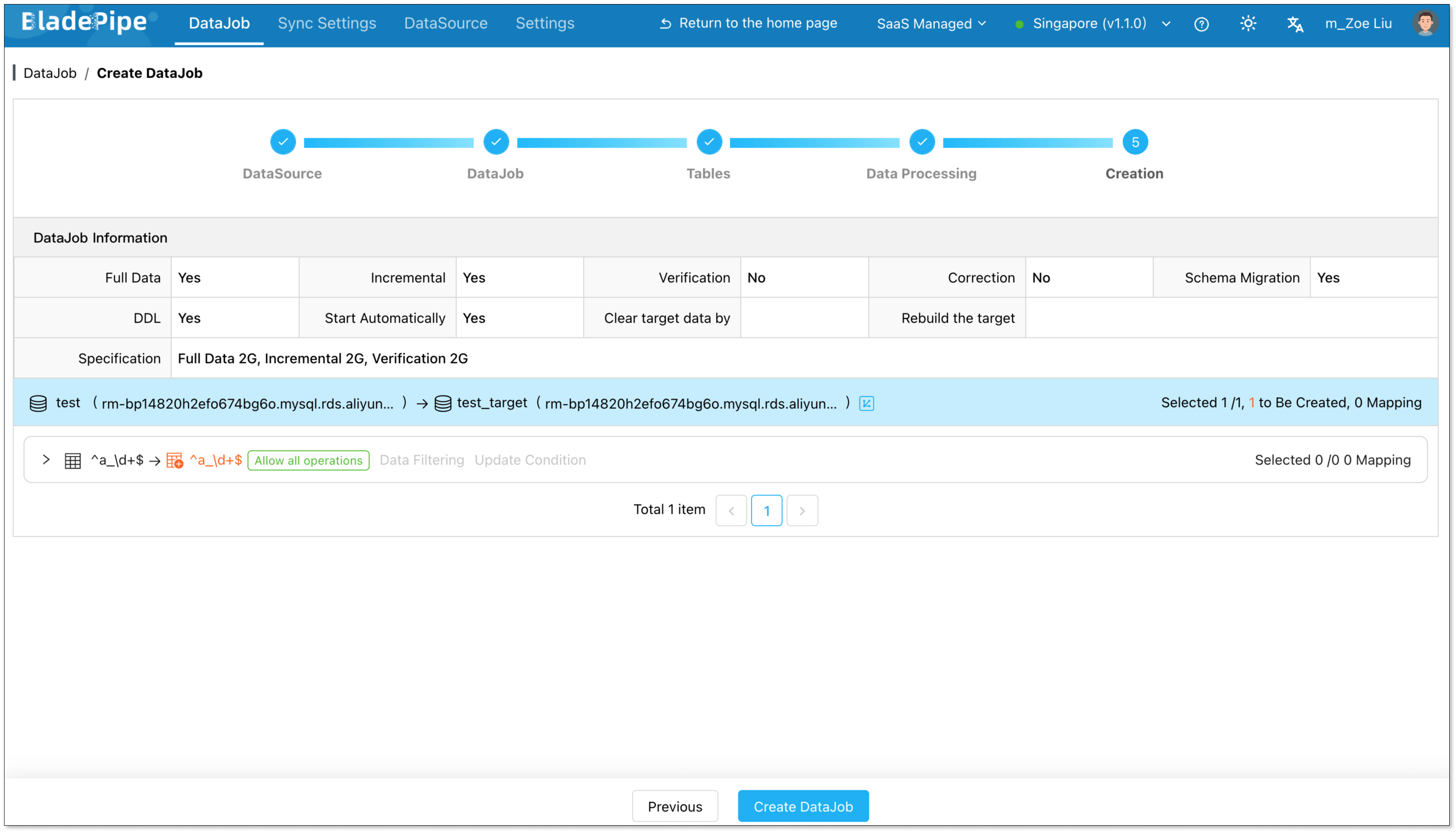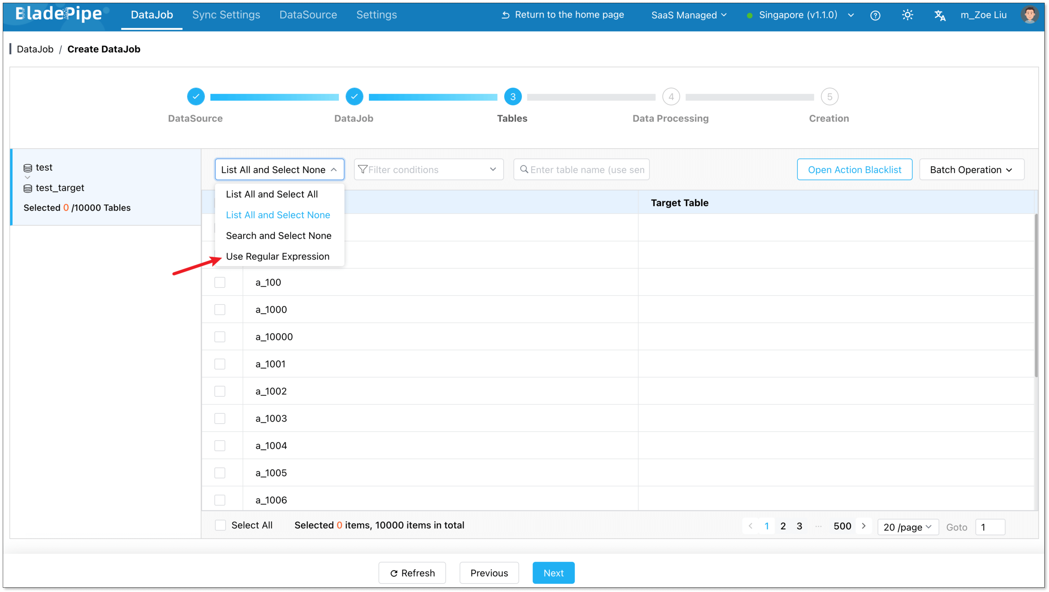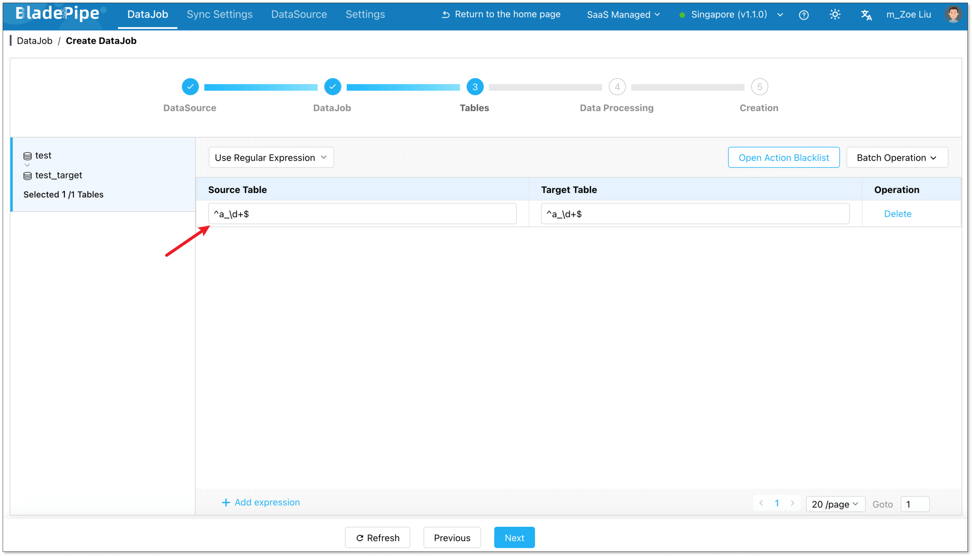 Based on this principle, BladePipe supports regex-based table name matching. Any table whose name matches the expression is automatically included in the sync task. That means, one expression can cover thousands or tens of thousands of tables.
