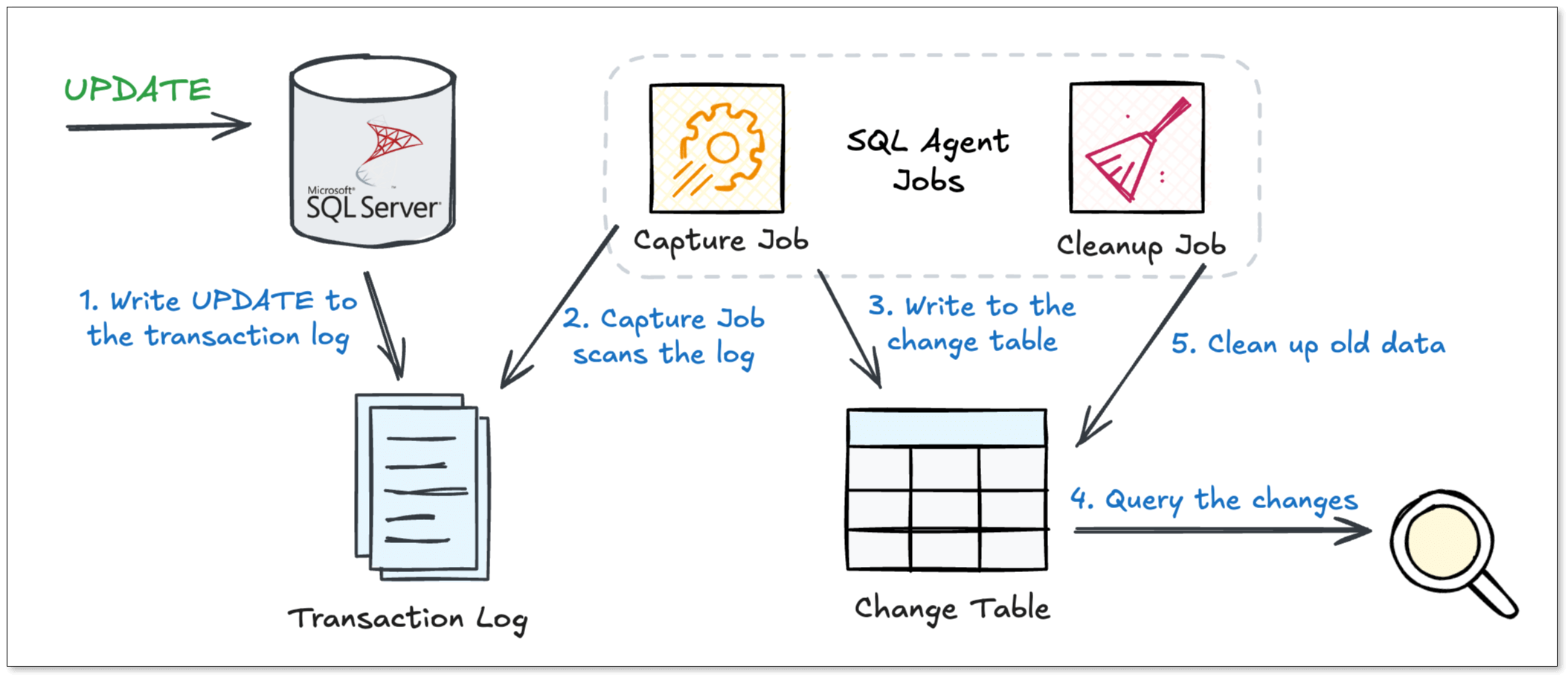 Once enabled, SQL Server creates a dedicated change table for each tracked source table. Downstream systems can query these change tables to fetch new changes in order.