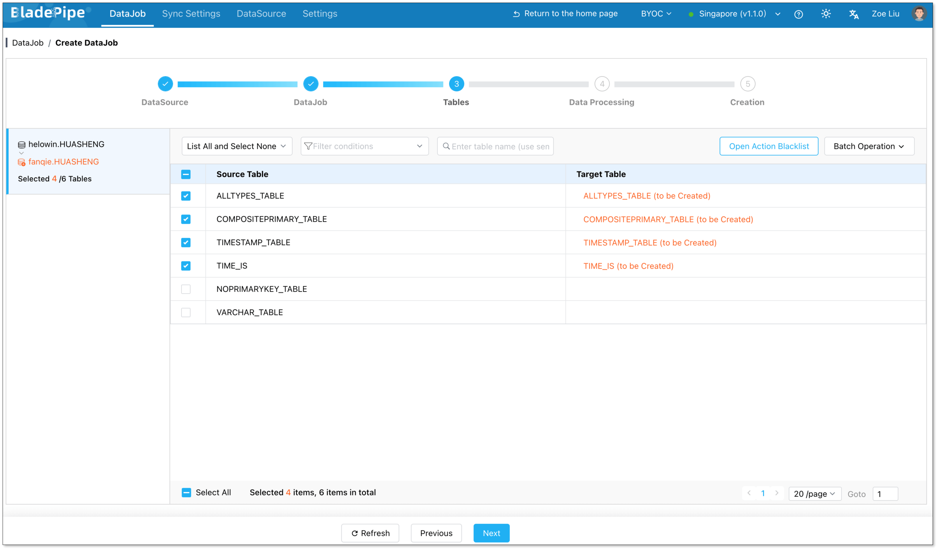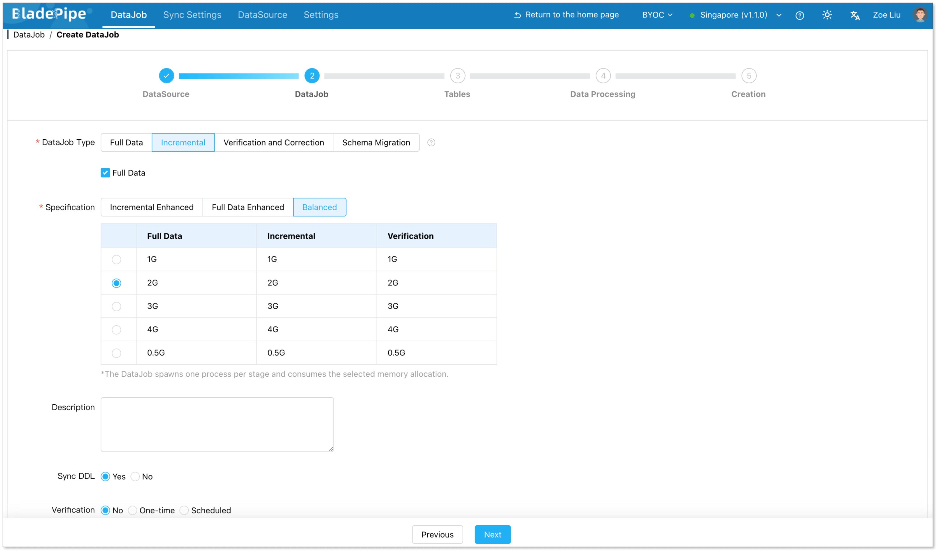 3. For one-time migration, select Full Data for DataJob Type. For continuous replication, select Incremental, together with the Full Data option.