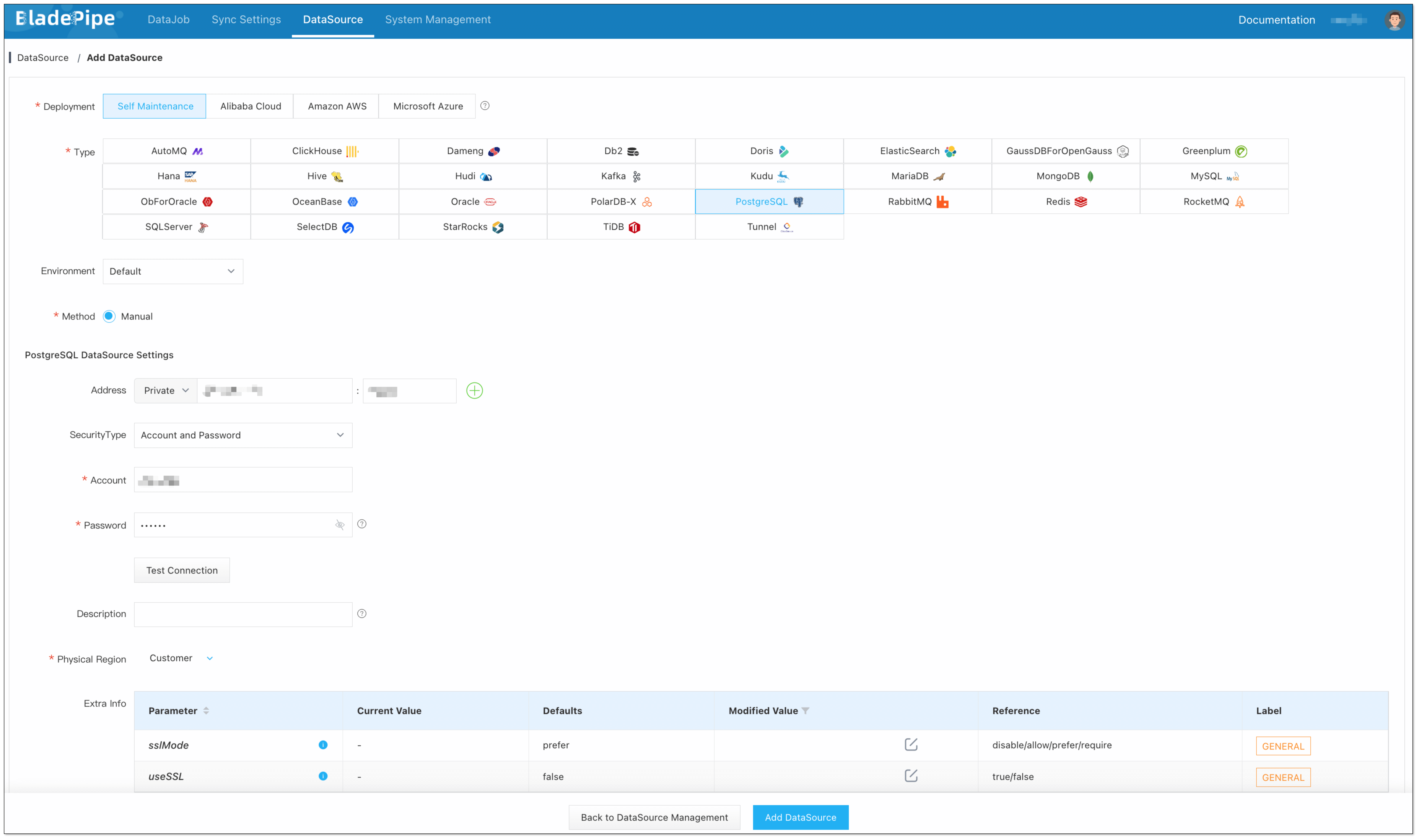 - Click DataSource > Add DataSource.