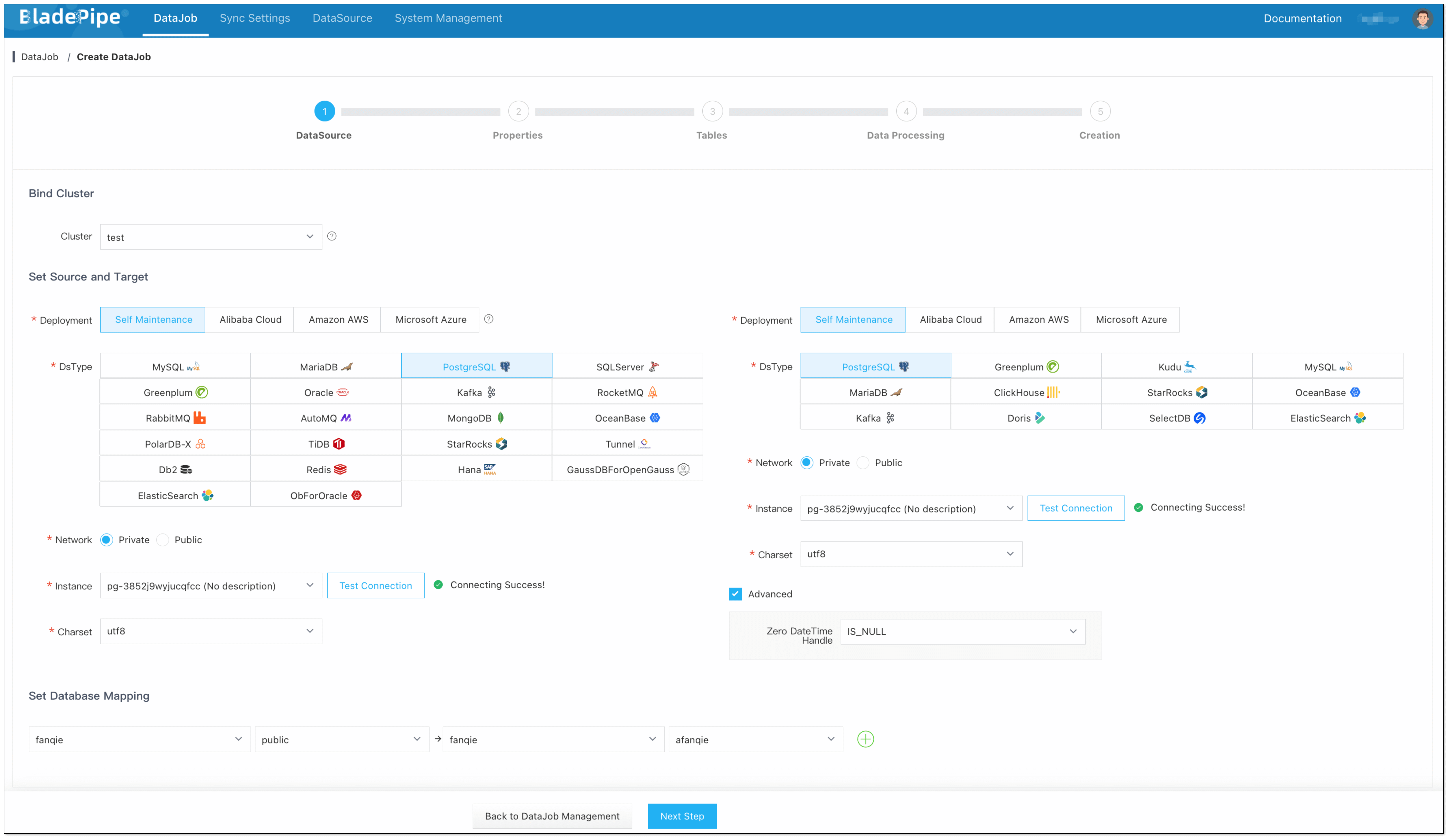 - Select the source and target DataSource type, and fill out the setup form respectively.