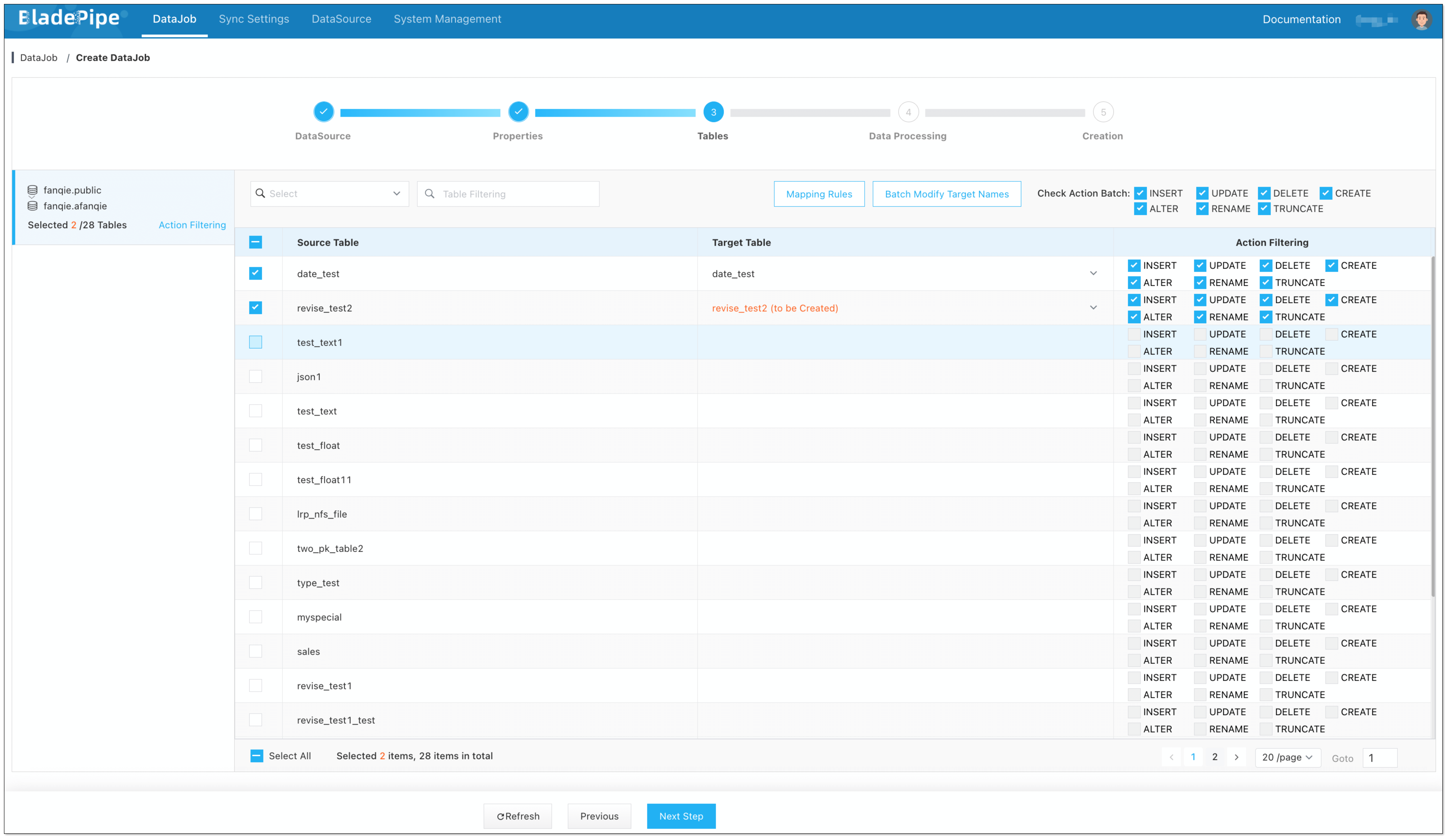 信息If you need to select specific columns for synchronization, you can create the corresponding tables in the Target in advance.