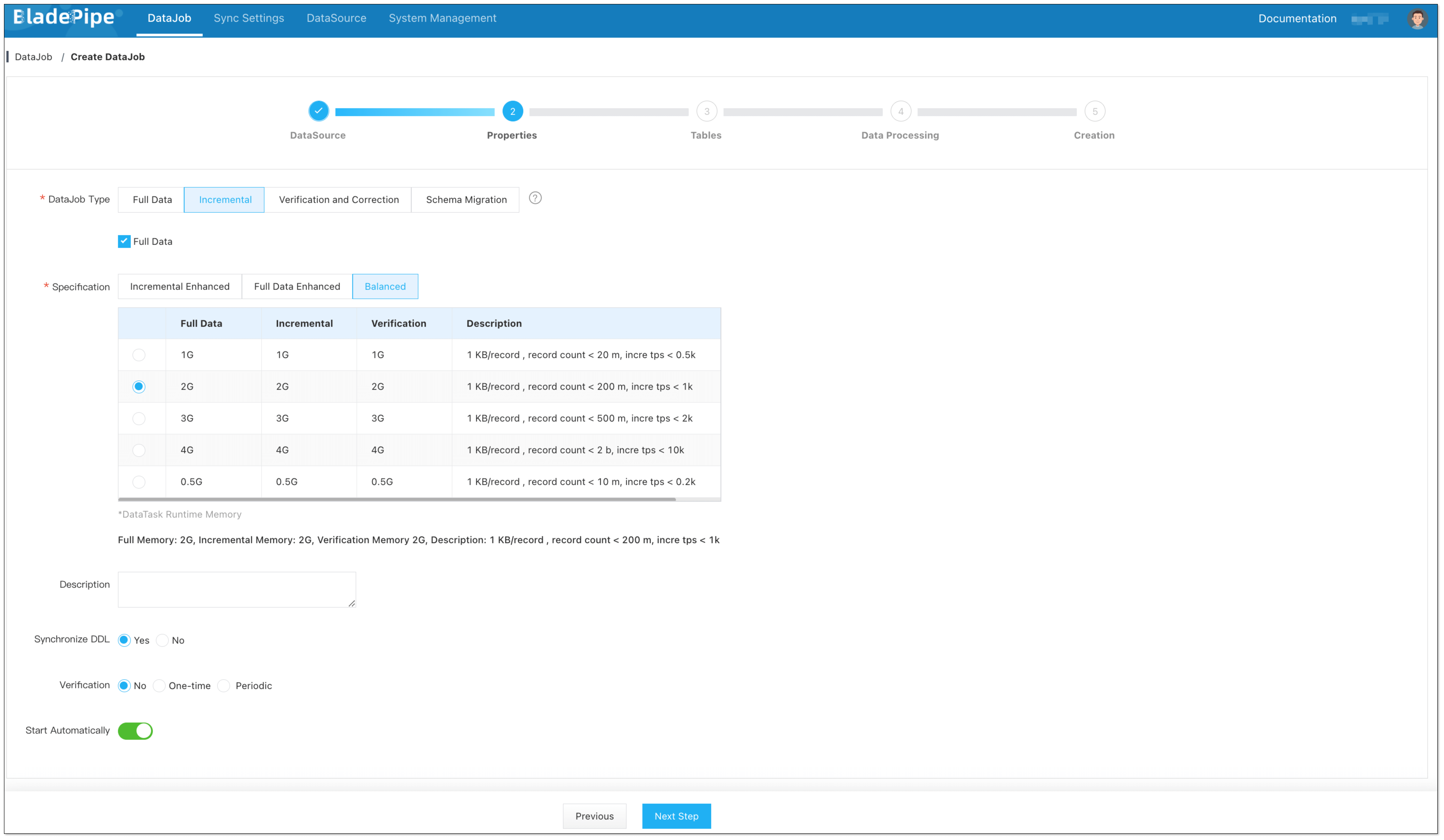 Select Incremental for DataJob Type, together with the Full Data option.