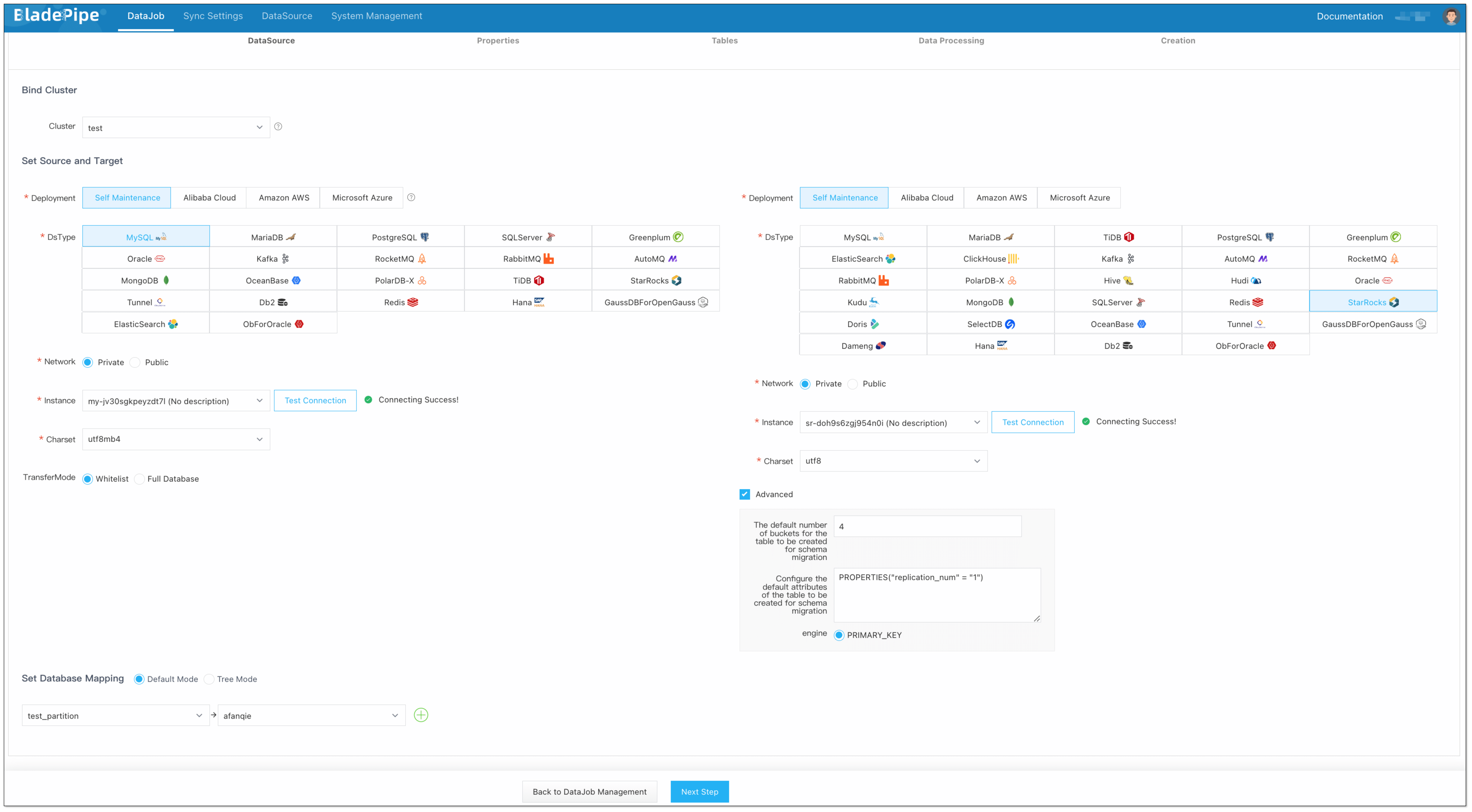 Select the source and target DataSources, and click Test Connection to ensure the connection to the source and target DataSources are both successful.