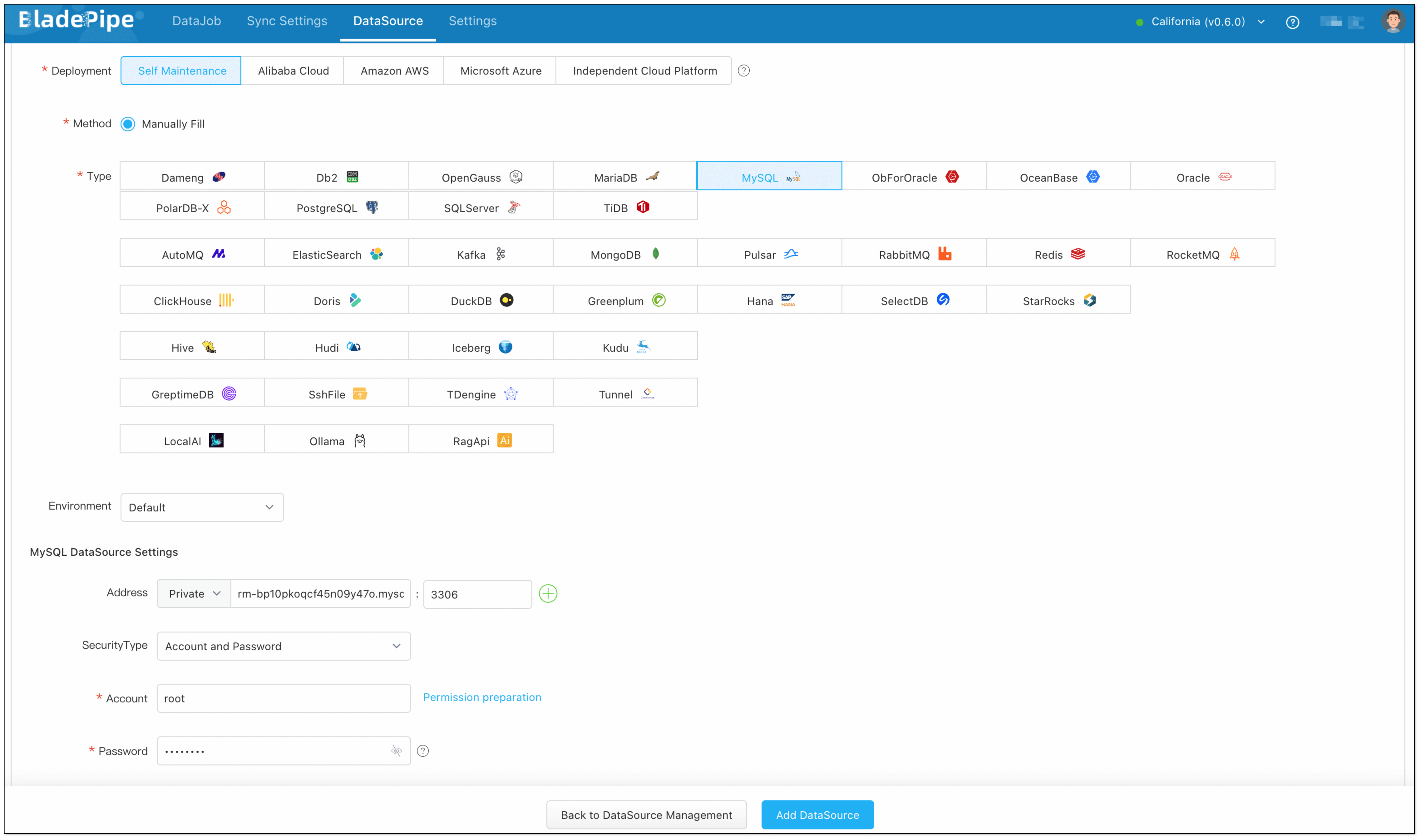 - Log in to the BladePipe Cloud. Click DataSource > Add DataSource. It is suggested to modify the description of the DataSource to prevent mistaking the databases when you configure two-way DataJobs.