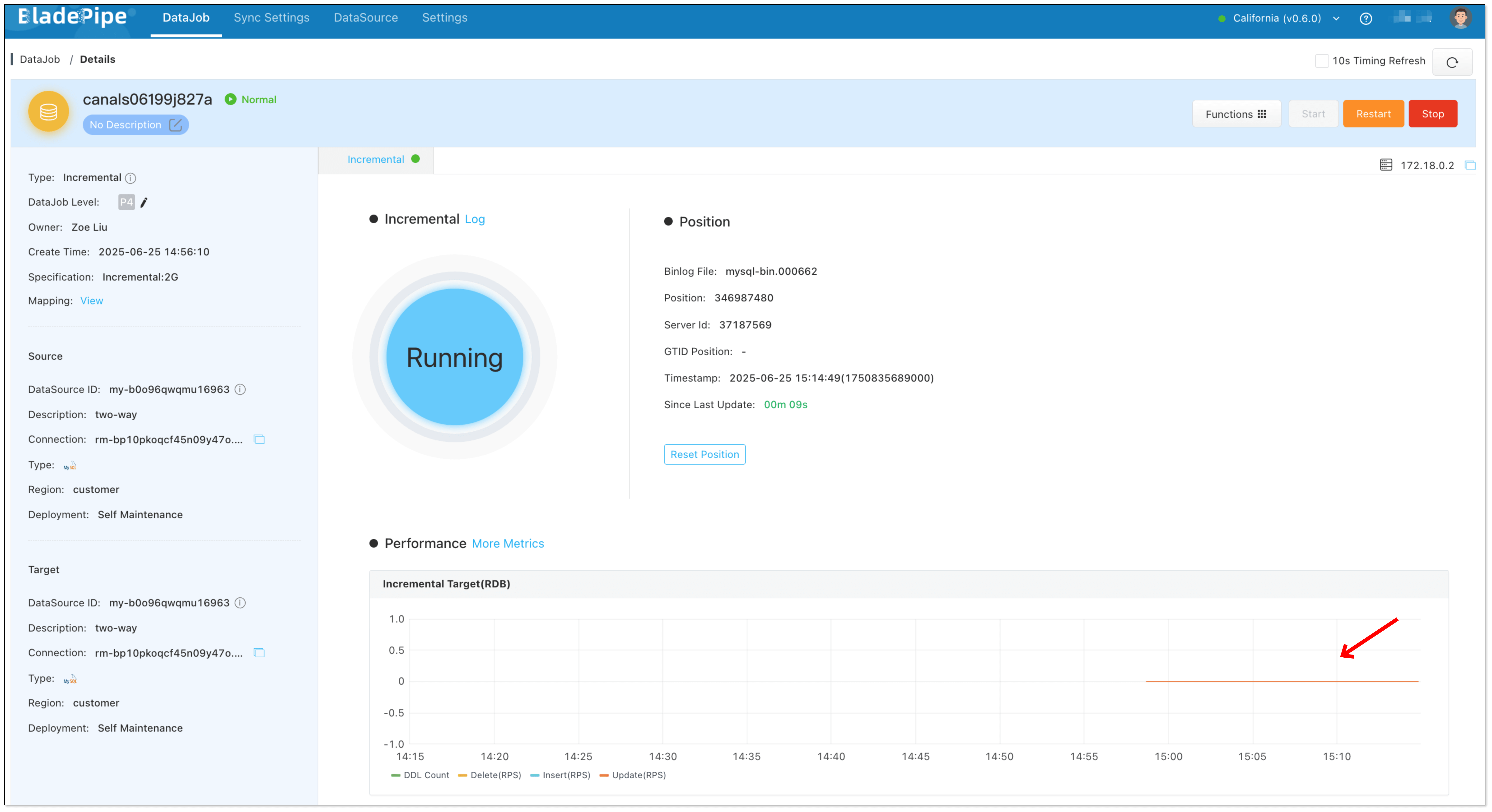- Do some DMLs in the target database. You can see there are changes in reverse DataJob monitoring charts but no changes in forward DataJob.
