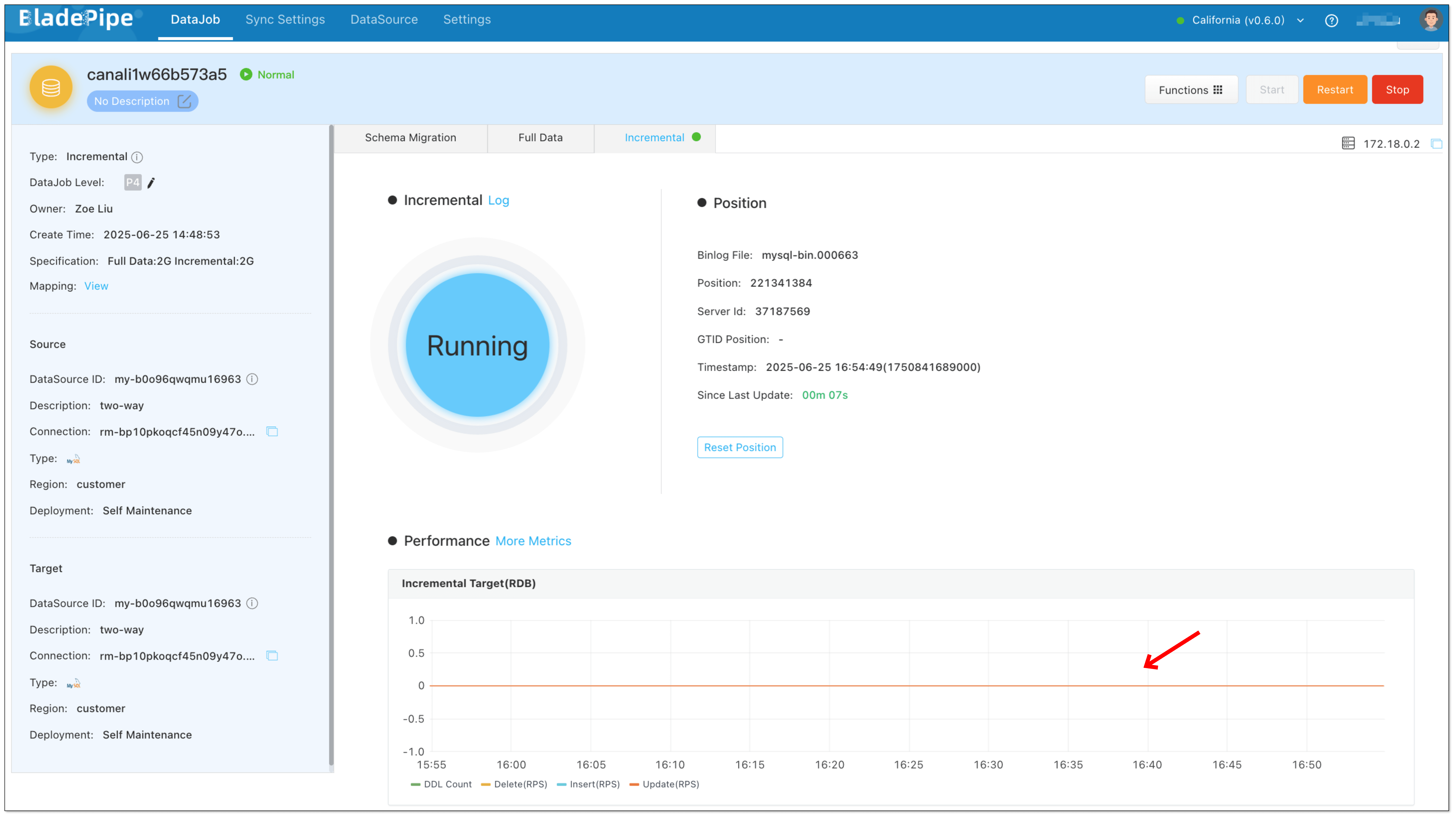 - Do some DMLs in the source database. You can see there are changes in forward DataJob monitoring charts but no changes in reverse DataJob.