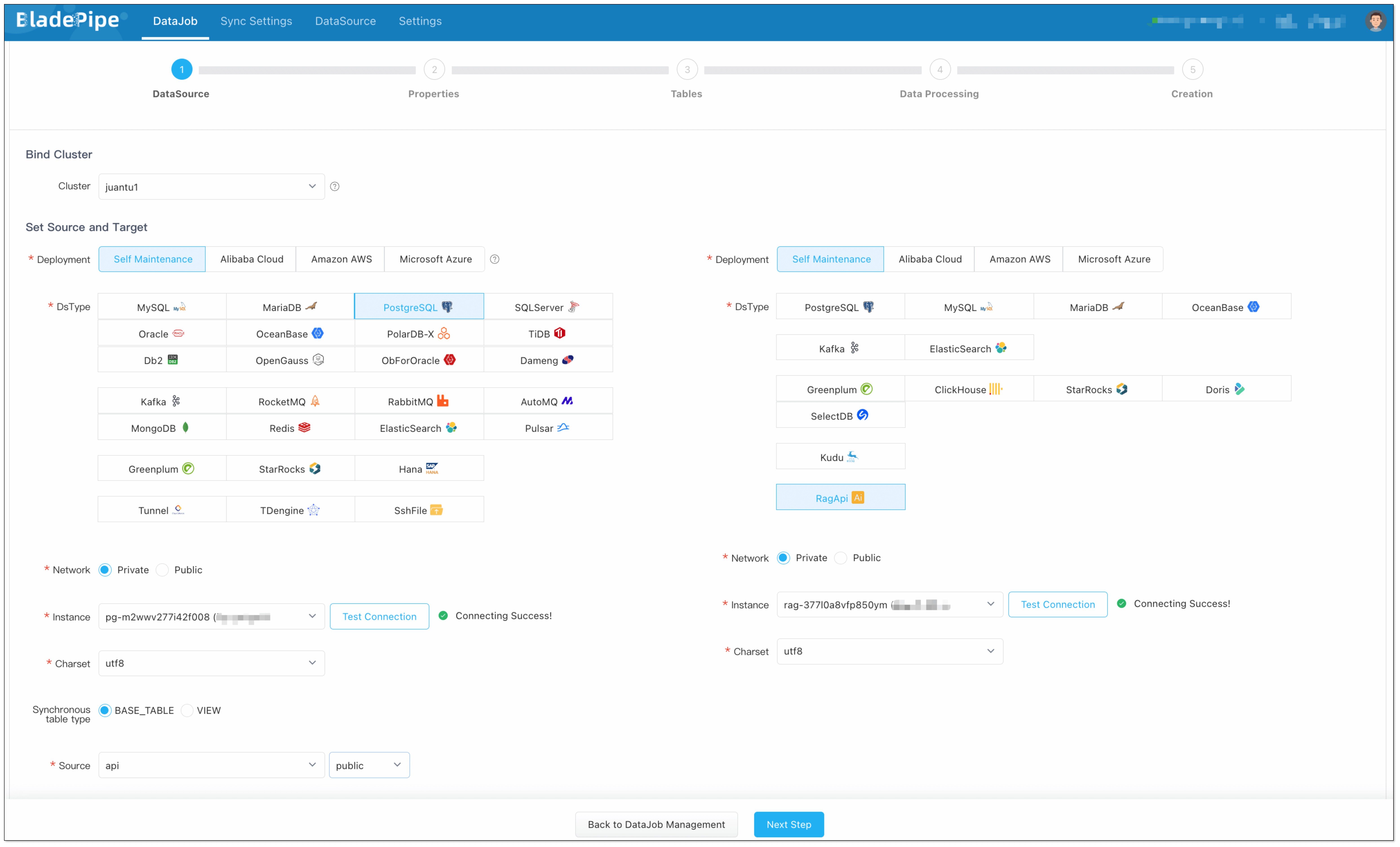 - Select the source DataSource (PostgreSQL with embeddings stored) and target DataSource (RagApi), and click Test Connection.