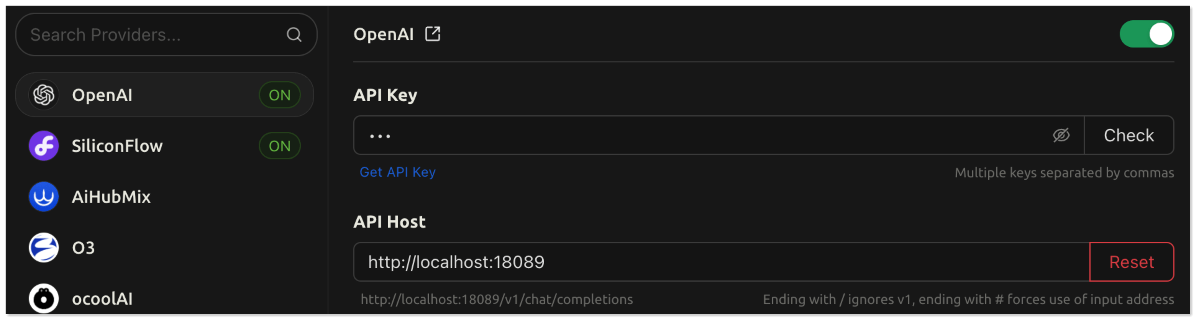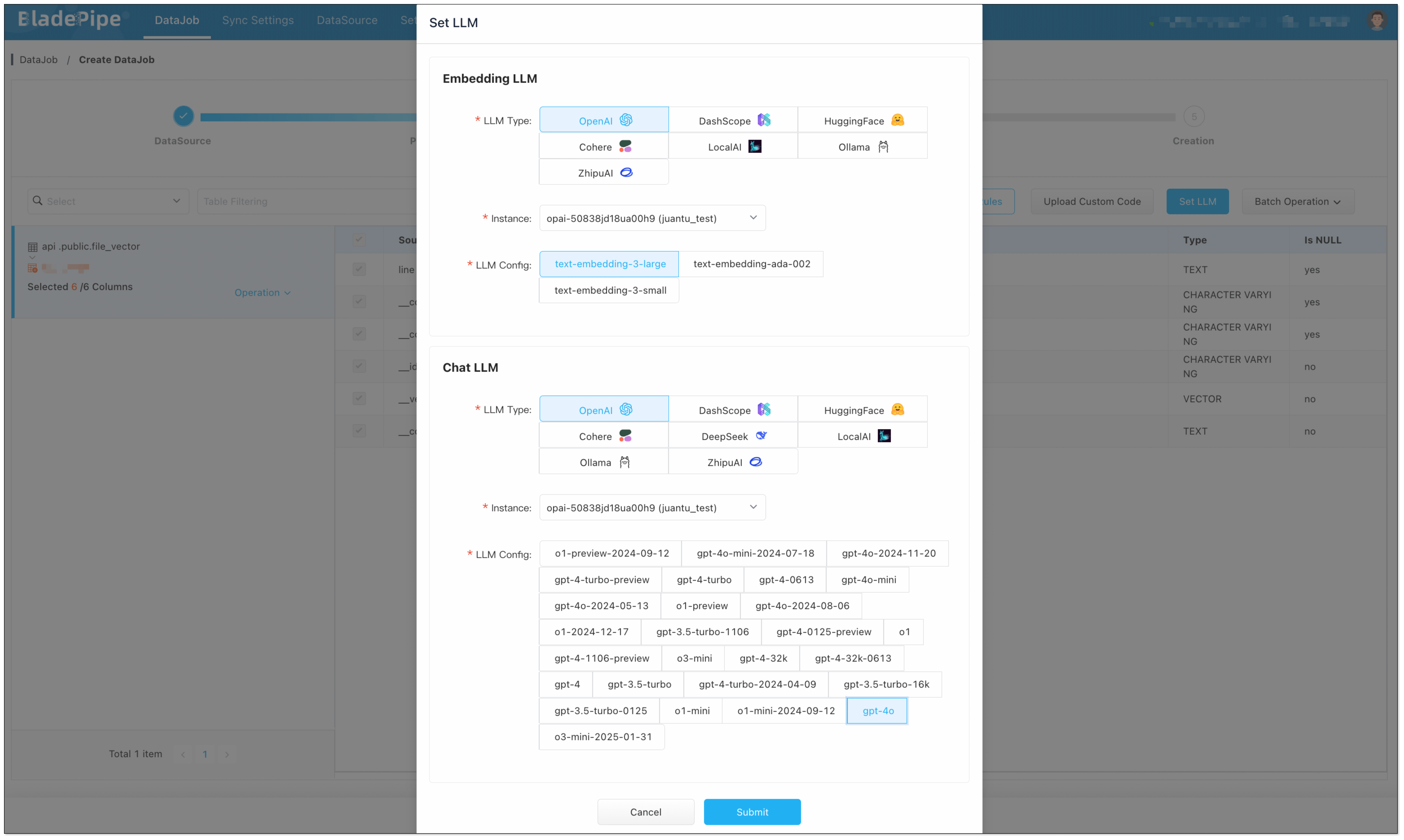 BladePipe uses the Chat model, together with the context obtained from the vector queries, to reason about the API request. Currently, the supported Chat models are as follows: