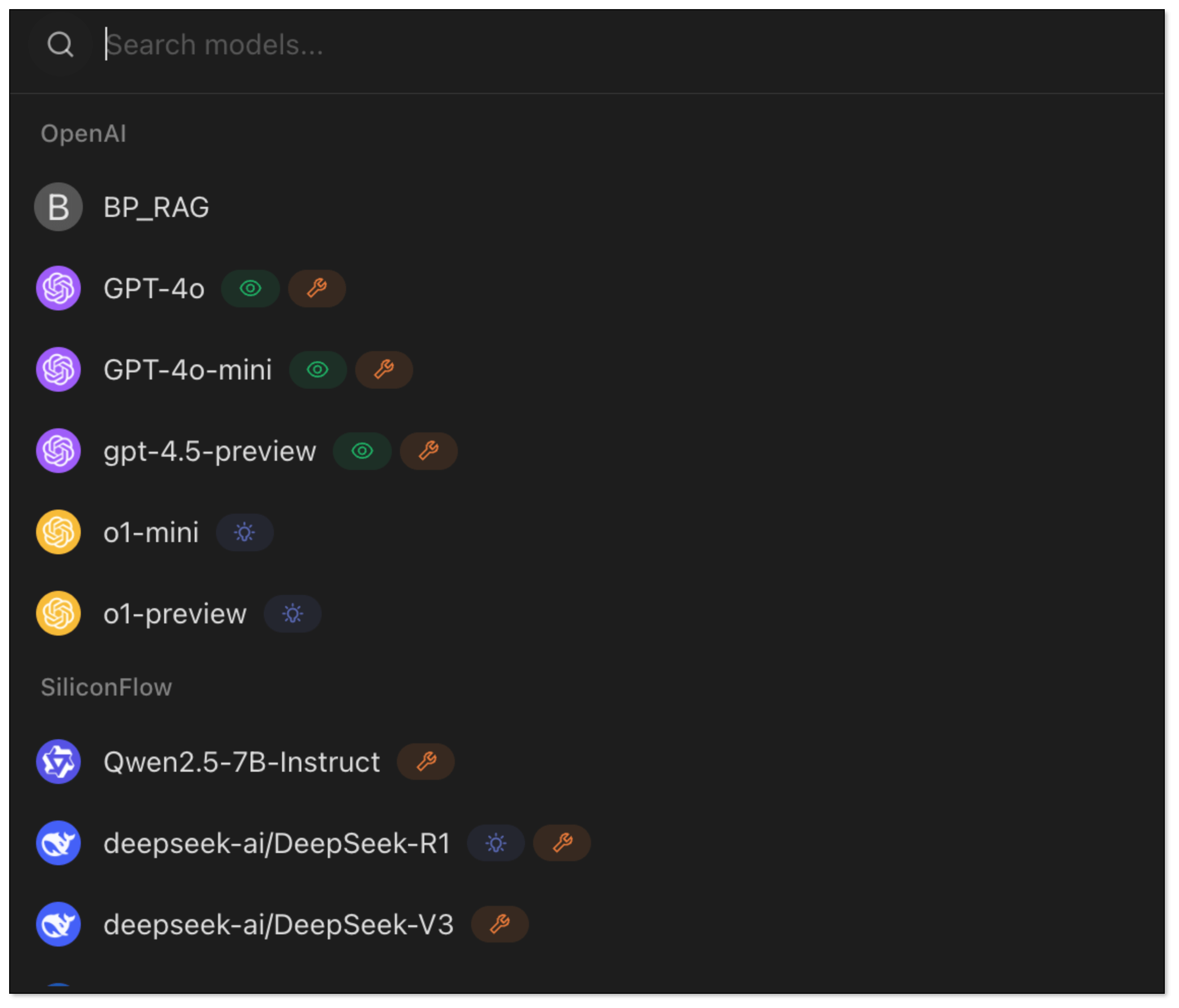 | OpenAI | gpt-4o o1 o1-mini o3-mini ... |