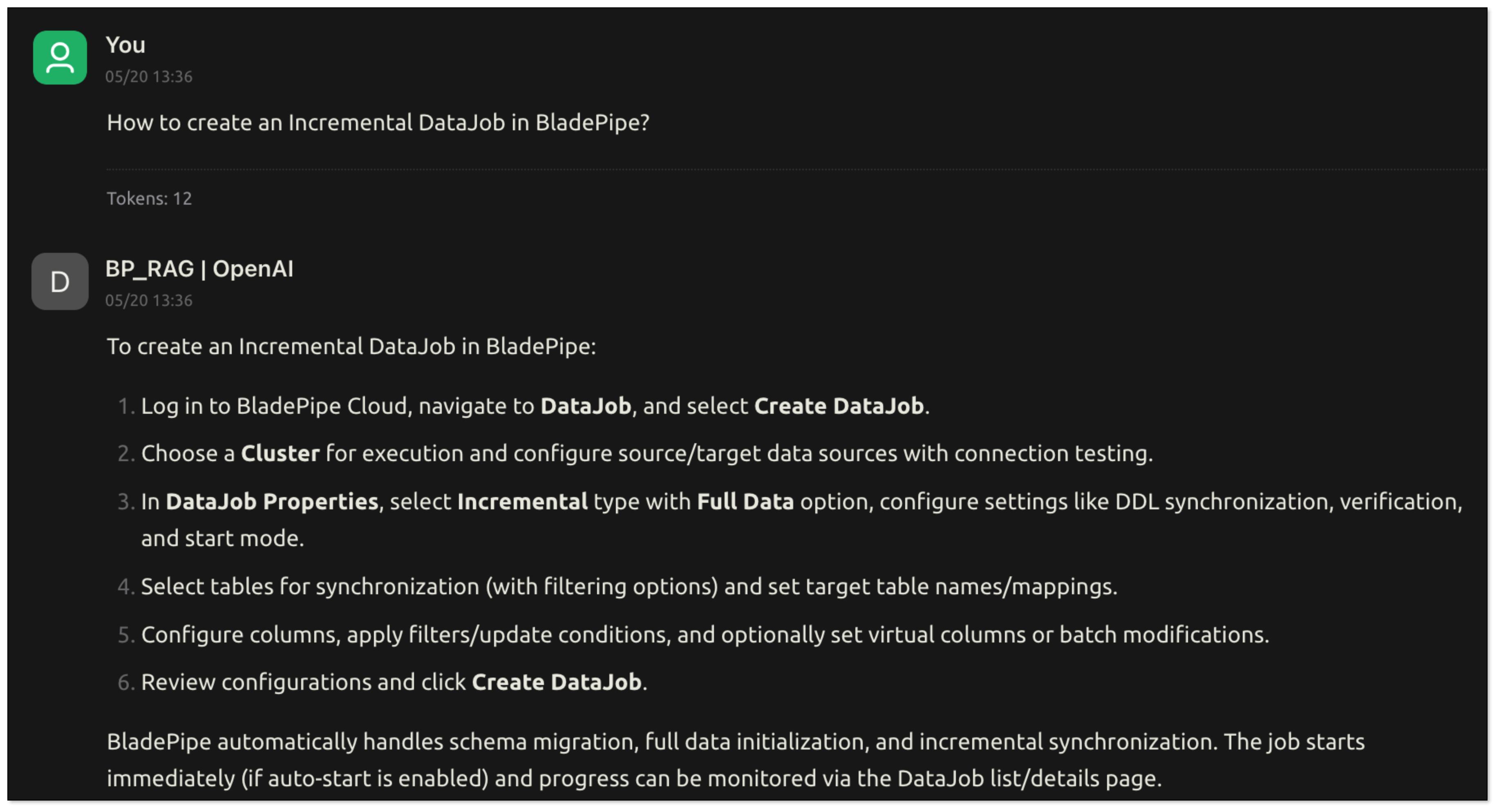 How to create an incremental DataJob in BladePipe?. RagApi will search your vector database and generate a response using the chat model.