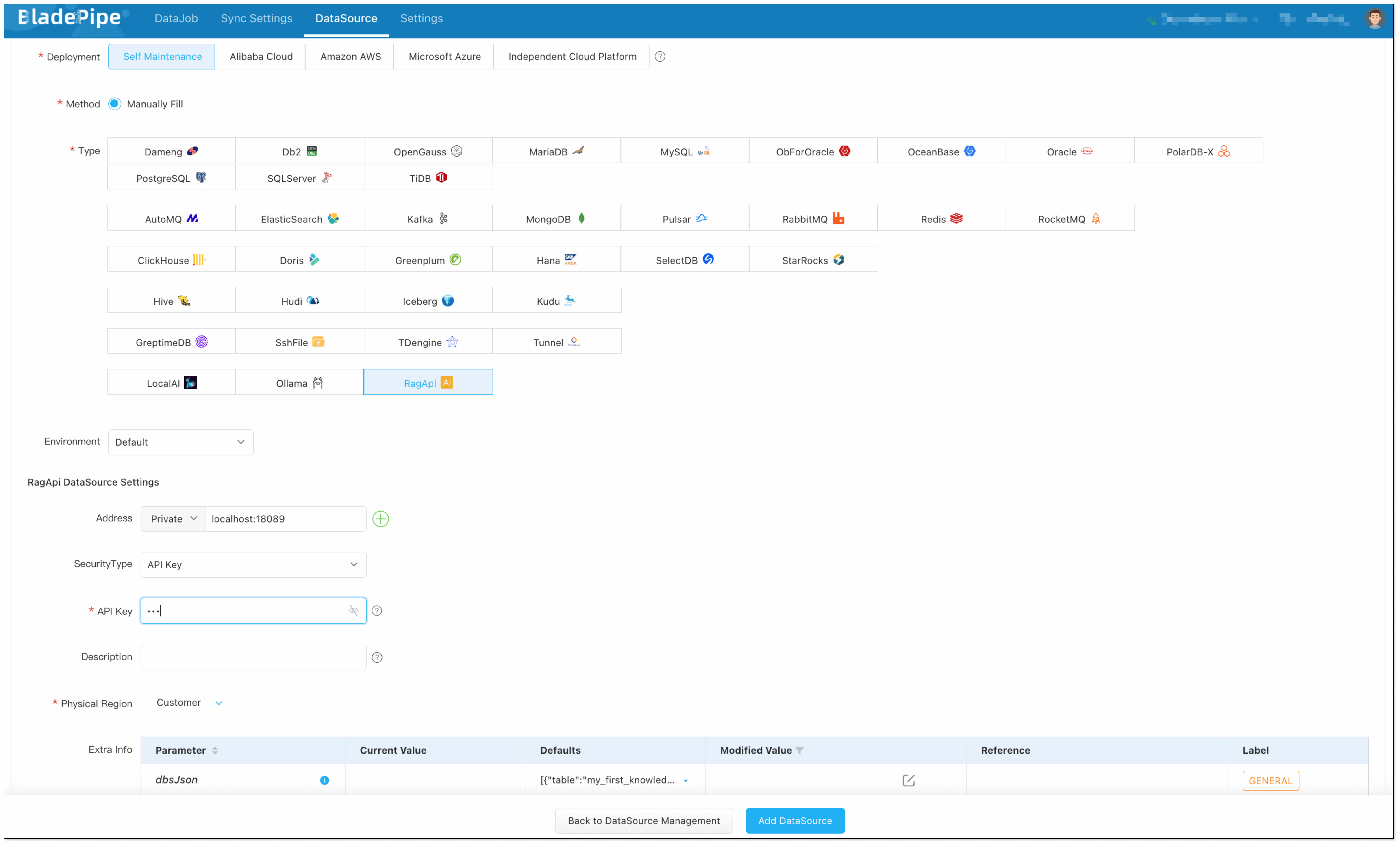 API Key: Enter the RagApi API Key configured in BladePipe.