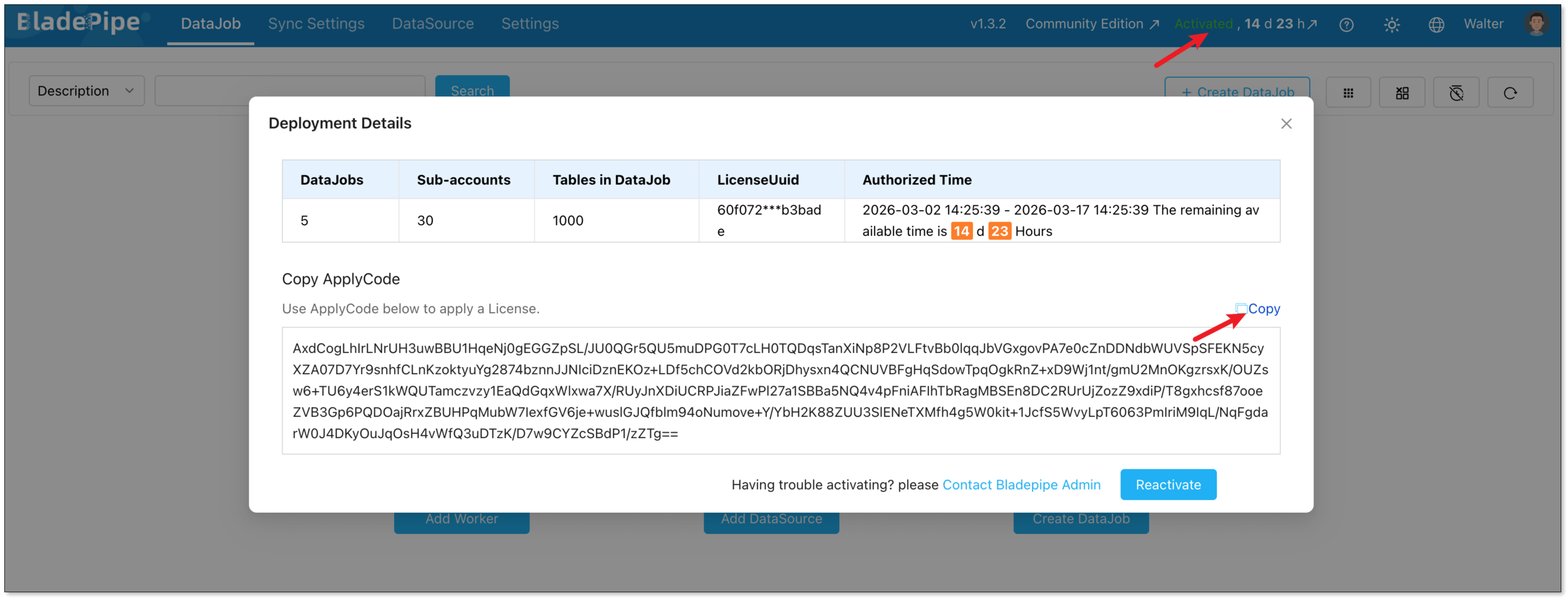 If BladePipe is in Activated status, you can click Reactivate and the Enter License box will appear.