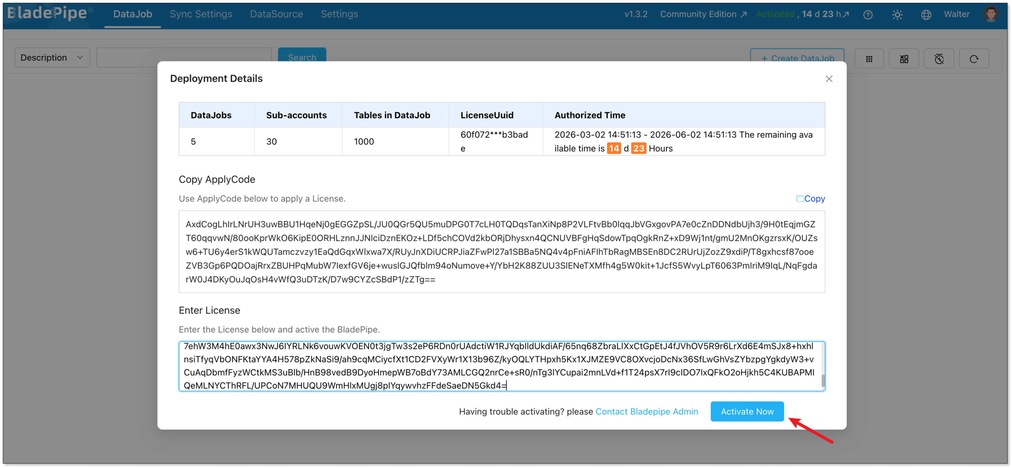 - In the Deployment Details dialog, paste the license to the Enter License box, and click Activate Now.
