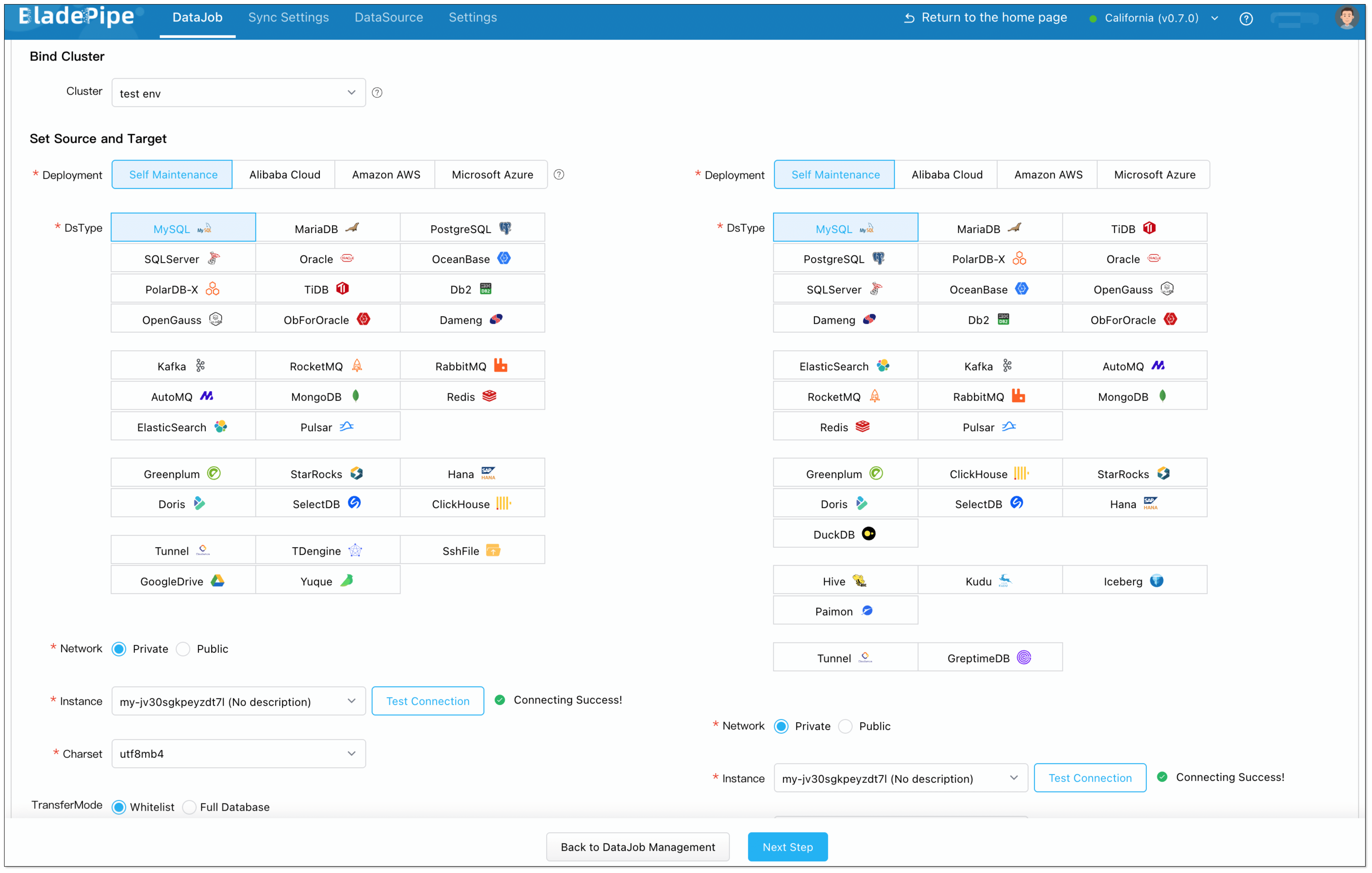 - Select the added MySQL instance as both the Source and Target, and click Test Connection. Then click Next Step.