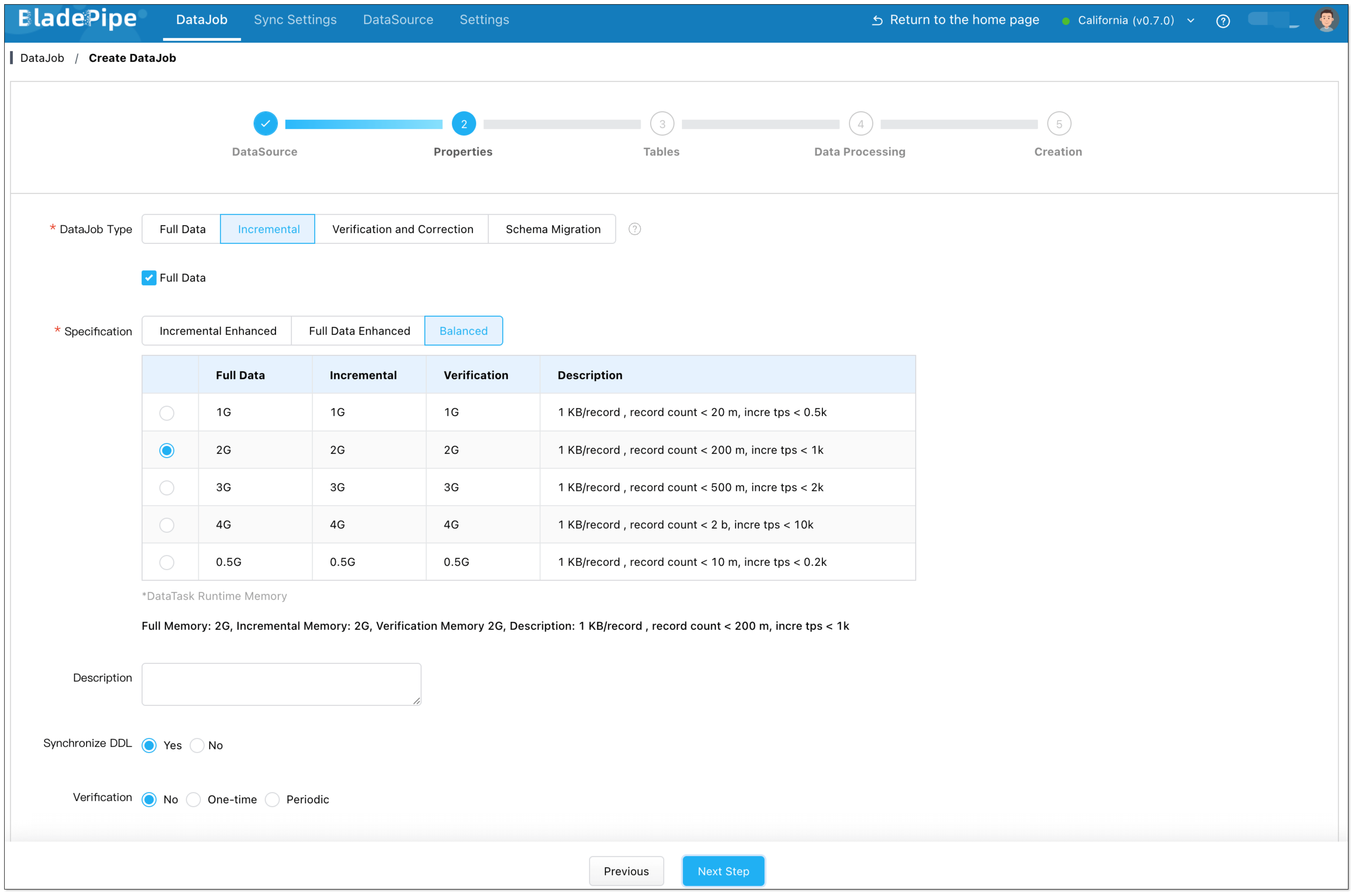 - Choose Incremental as the DataJob type, and select Full Data. Then click Next Step.